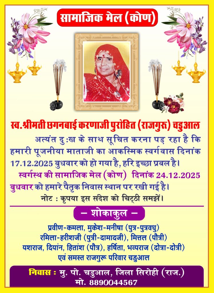 3. रेवदर में समाज के कुल 400 घर है जिसमें रायगुर गौत्र के … जिनकी कुलदेवी आशापुरा माताजी है